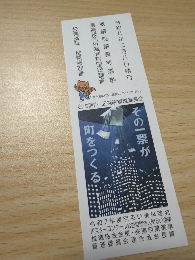 だから、完璧な納得がなくても、選挙だけは必ず行くことにしている。まぁ、文句言うために行っているともいえるんだけどね。(笑)投票すると、出口で投票済み省がもらえる。投票済証に「令和八年二月八日執行」みたいな表記があって、「わし、ちゃんと投票したぞ」と実感が残るのもいい。